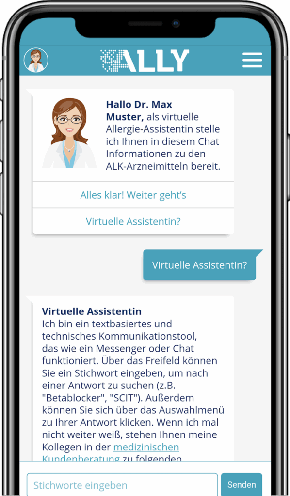 Das Herz von portAllergy: unsere virtuelle Allergie-Assistentin Ally. Ally gibt Ihnen schnelle Antworten auf Ihre Fragen zu ALK-Produkten und weiß auch eine Menge über andere Themen aus der Allergologie. Das neue „Teammitglied“ unserer medizinischen Kundenberatung ist direkt über unsere App zu erreichen. Wenn Ally nicht weiter weiß, vermittelt sie gern den direkten Kontakt in die medizinische Kundenberatung.